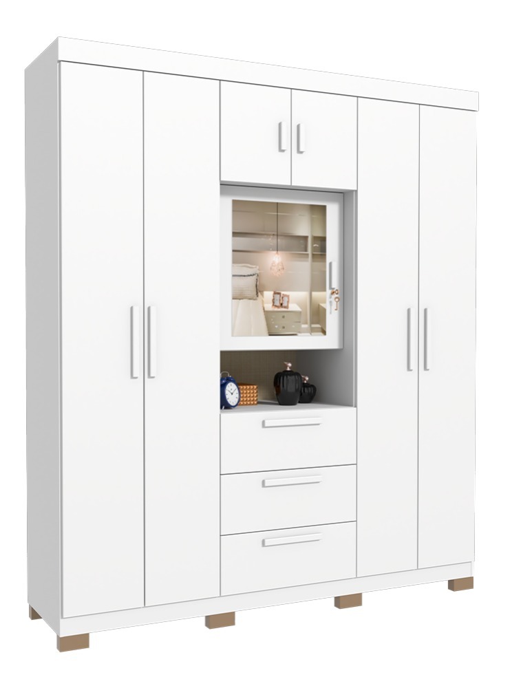 O Roupeiro Catania destaca-se por sua combinação de design elegante e funcionalidade prática. Com duas portas laterais de cada lado, ele oferece organização e acesso fácil às roupas. As duas portas superiores maximizam o uso do espaço vertical, enquanto a porta central com chave e espelho incorporado traz segurança e conveniência. O nicho abaixo da porta central é perfeito para itens decorativos ou de uso frequente, e as três gavetas externas com corrediças telescópicas permitem uma abertura completa e suave, facilitando o acesso. Além disso, o roupeiro é projetado para proporcionar um ótimo espaço interno, garantindo uma solução de armazenamento ampla e eficiente para qualquer ambiente.
